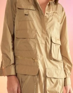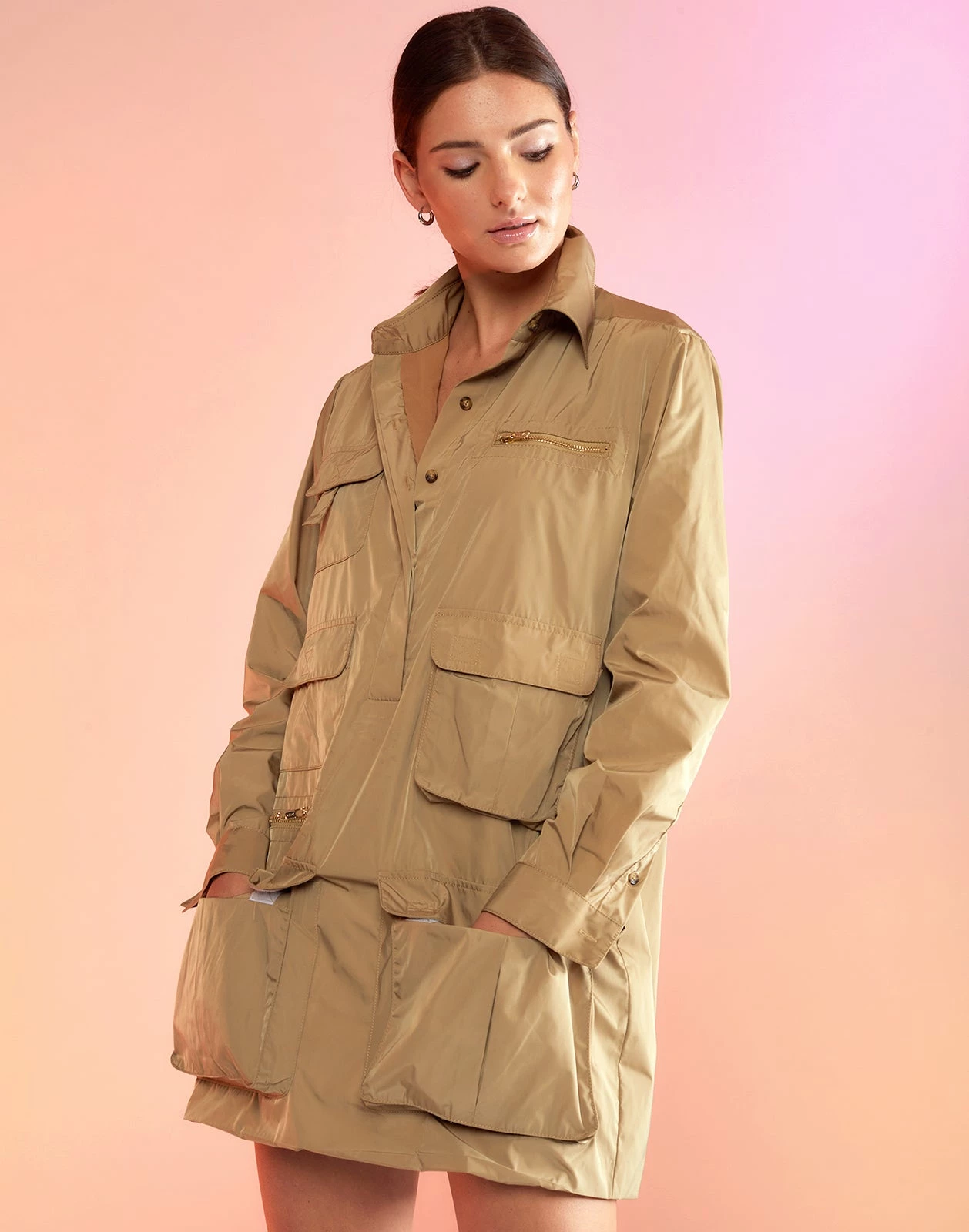 Utility jacket inspired dress with patch pockets.Â