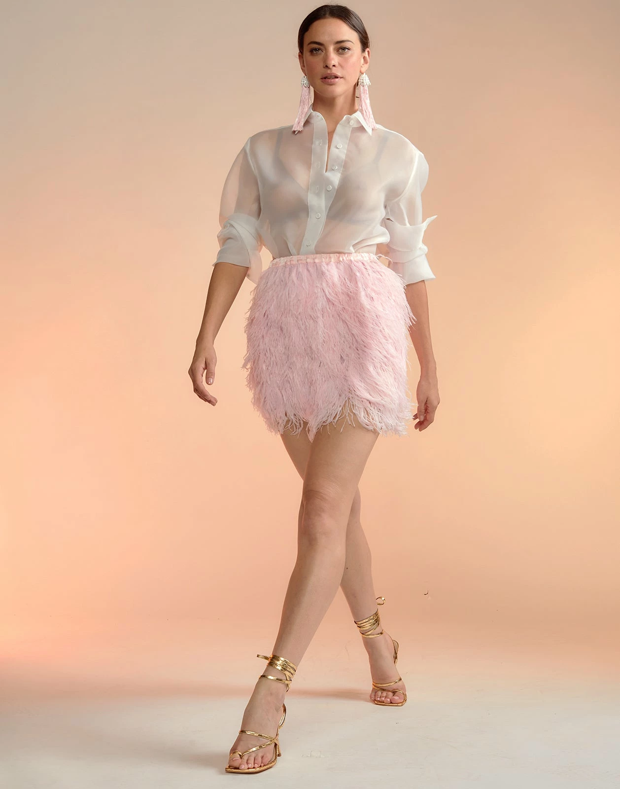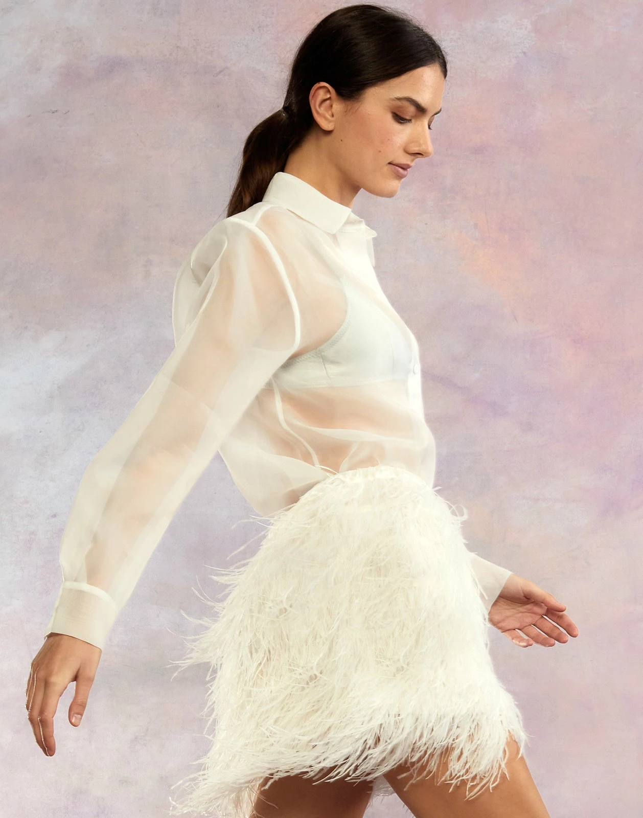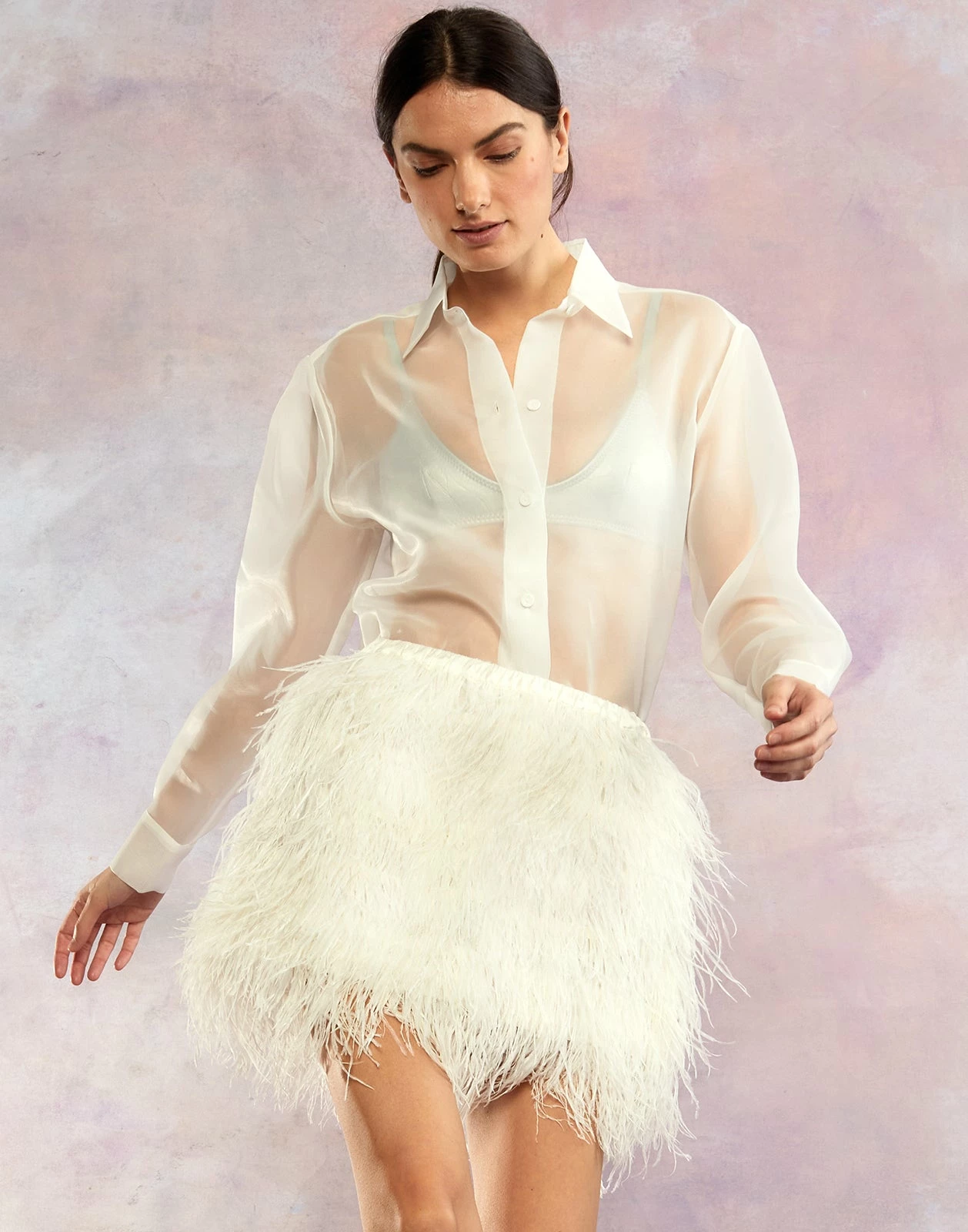Organza button down boyfriend shirt. Pair with your favorite jeans, pants, and shorts, or dress it up with a skirt!Â