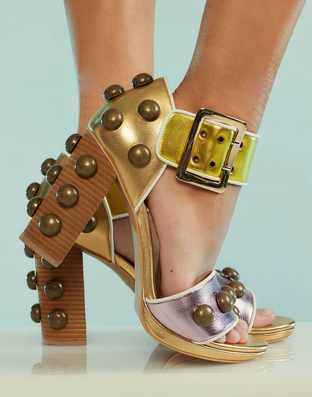 - Metallic pink toe with gold color block strap and wood heelÂ